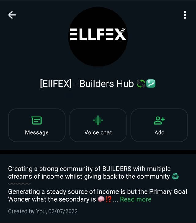 The ELLFEXX BUILDERS HUB is a web3 / Tech based community and project in motion aimed at Creating a strong foudation of builders with multiple streams of income whilst creating awareness about the world of Tech and the opportunity it brings, and of course giving back to the community by helping other projects Drive in more adoption for their products